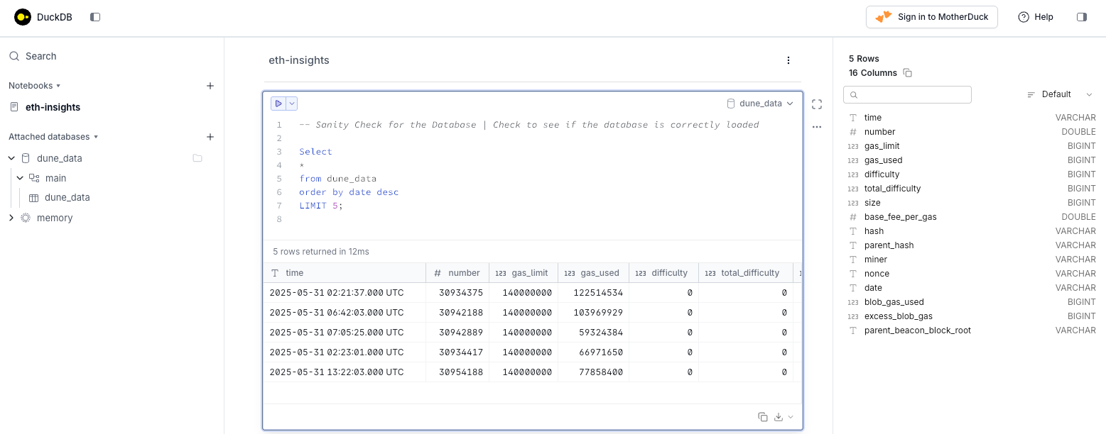 The above table shows us that the gas utilization is consistent for most blocks but some anomalies can be detected and analyzed for optimization & correction.For more complex analysis, the data needs to be moved to performance optimized analytical databases.Let's have a look at analyzing the data on database like DuckDB.