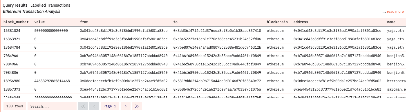 The best way to get started in Dune is to find the pool of content specific to a Blockchain and use their inbuild tables to run simple SQL queries.In the below query, we are combining Ethereum Transaction data with another table called ens in the labels database that allows us to attach a domain name to a transaction wallet.