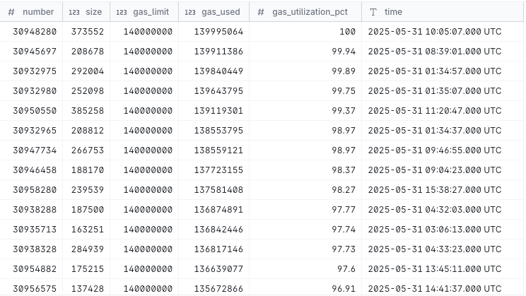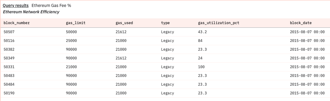The above query is similar to the one we saw before in Dune Analytics where it returns the gas utilized percentage for each block to understand where the network can be optimized.